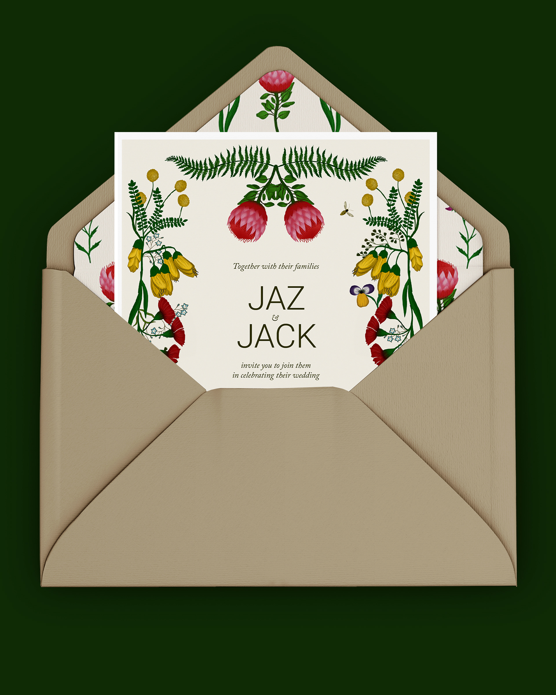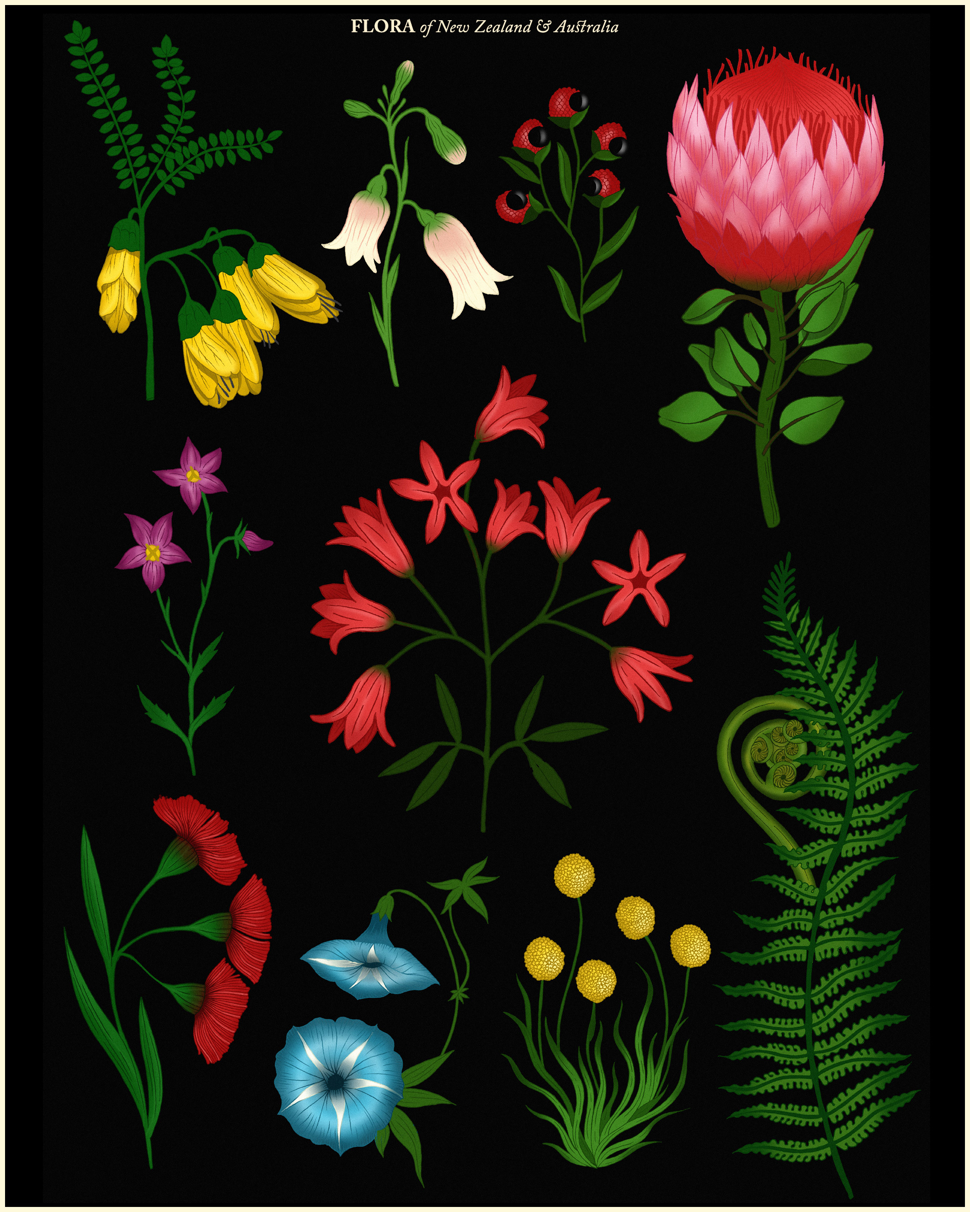For this commission, I have illustrated a series of iconic wild flowers native to the Pacific Ocean region, as a symbol of union between Jaz and Jack respectively from Australia and New Zealand.